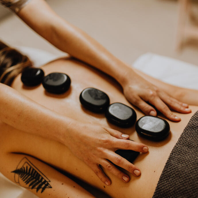 Type of massage in which the masseuse places smooth, hot stones on your back. These stones provide heat therapy to the muscles, which can help reduce tension and pain.